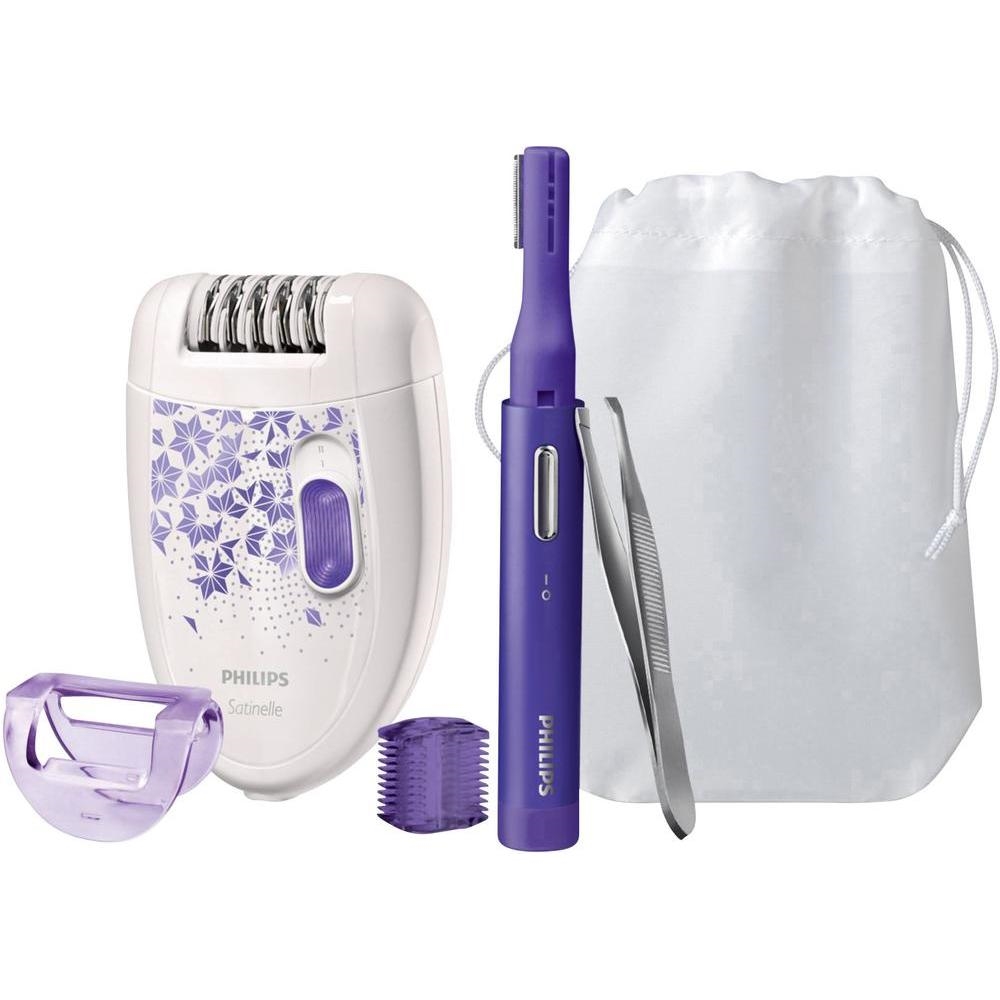 Depiladora Satinelle, accesorio ASY START, perfilador morado, pinzas de depilar, bolsa