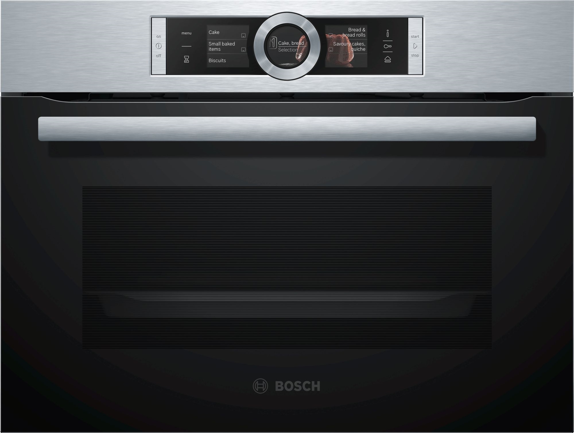 Forno compacto com VAPOR, Inox, 3 visores TFT 2,5"c/ imagens, Cl. Energética A+, EcoClean Direct (parede posterior), 13 modos aquec., 47 L, foco LED, Assist (Assistente de cozinha), Função 4D, SoftClose&SoftOpen